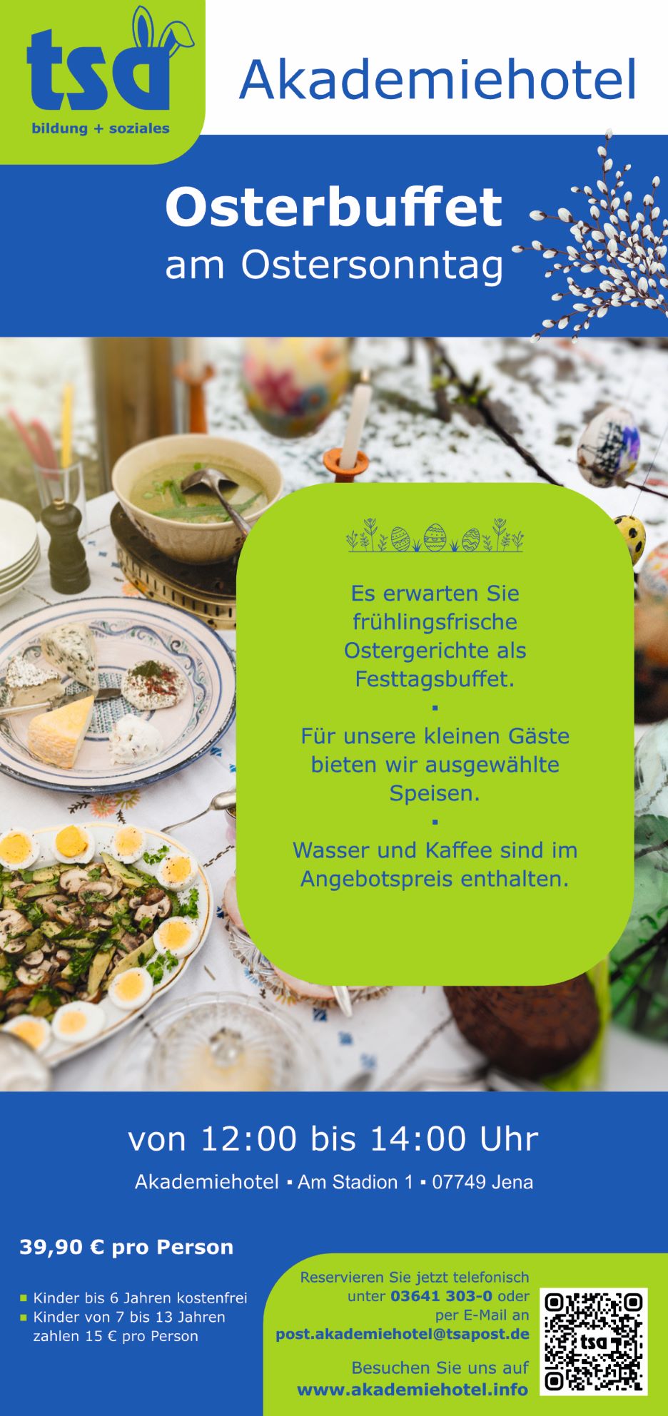 Am Ostersonntag können Sie es sich im Akademiehotel schmecken lassen. Es erwartet Sie ein Festtagsbuffet mit warmen und kalten Ostergerichten. Reservieren Sie am besten noch heuten Ihren Platz: